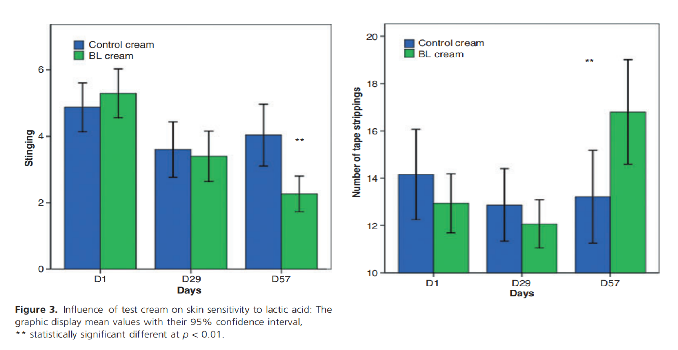 與安慰劑組相比,使用 BL 測試霜治療 2個月的組中,安慰劑中對皮膚的破壞不斷增加,而BL組中的屏障功能效果顯著增強(qiáng)